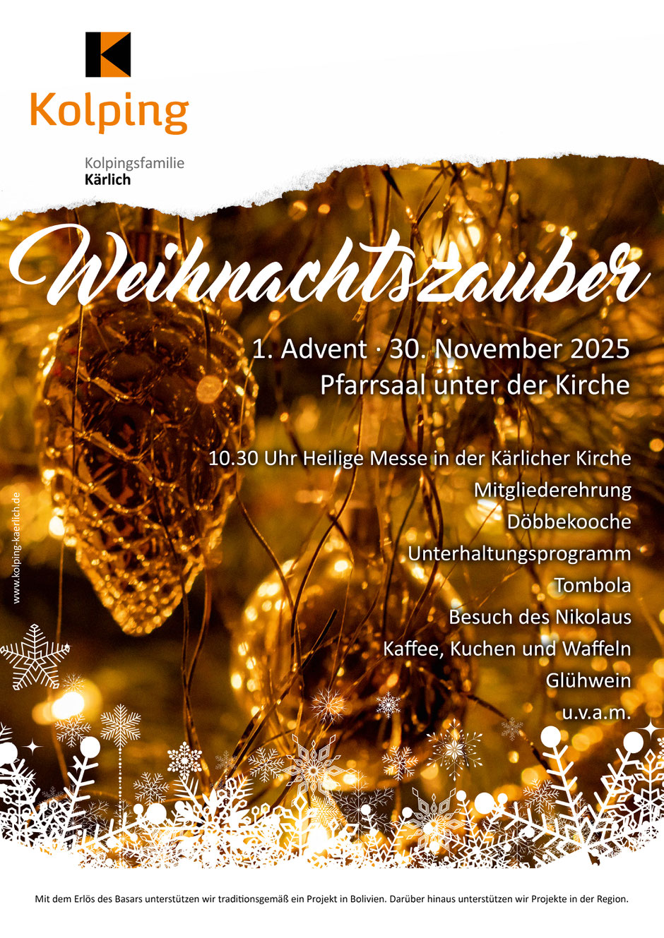 Nach dem Konzert lädt die Kolpingsfamilie Kärlich zu heißem Glühwein und Brezeln auf dem Platz vor der Kirche ein. Der Eintritt ist frei, wir bitten jedoch um eine Spende.